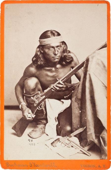 Fifteen years before, Pendleton lost his new bride, Isabella, to the Apaches—to Victorio in fact—though he didn’t know it at the time; Victorio now wears her ring around his neck even. Ever since, he’s been ruthless in the prosecution of his duties.