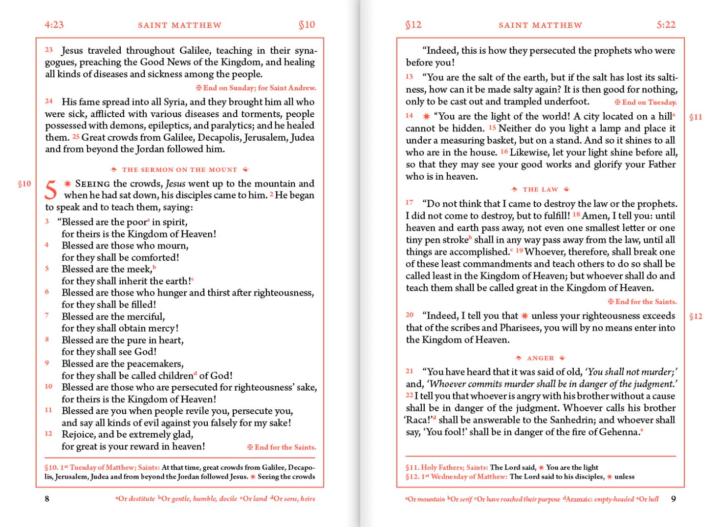 Magnificat produces an elegant gospel collection called The Illustrated Gospels, so titled because each gospel is festooned with medieval illuminations. It uses the Revised Standard Version (Catholic Edition). It’s also a gorgeous book and very well made.
