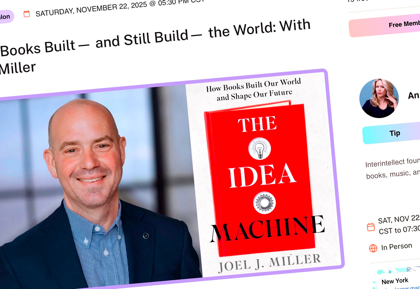 , I’ll be at Landmark Booksellers on launch day, November 18. Friend and author and I will have a conversation about the book and adjacent social and cultural questions. Jeff was instrumental in helping me get the book published so his involvement runs deep. This should be great event. Details here.Then, to close out pub week on November 22, I’ll be in New York for a Interintellect SuperSalon with