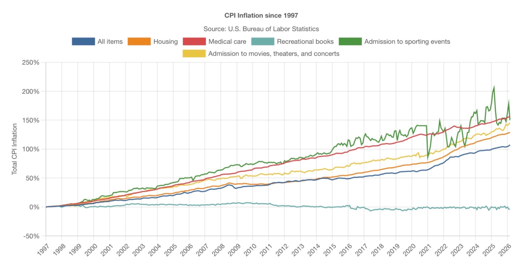 Now compare that to housing, healthcare, or admission to sporting events, movies, and concerts—all of which have actually trended higher than general inflation. In the adjoining chart, books represent the only flat line.