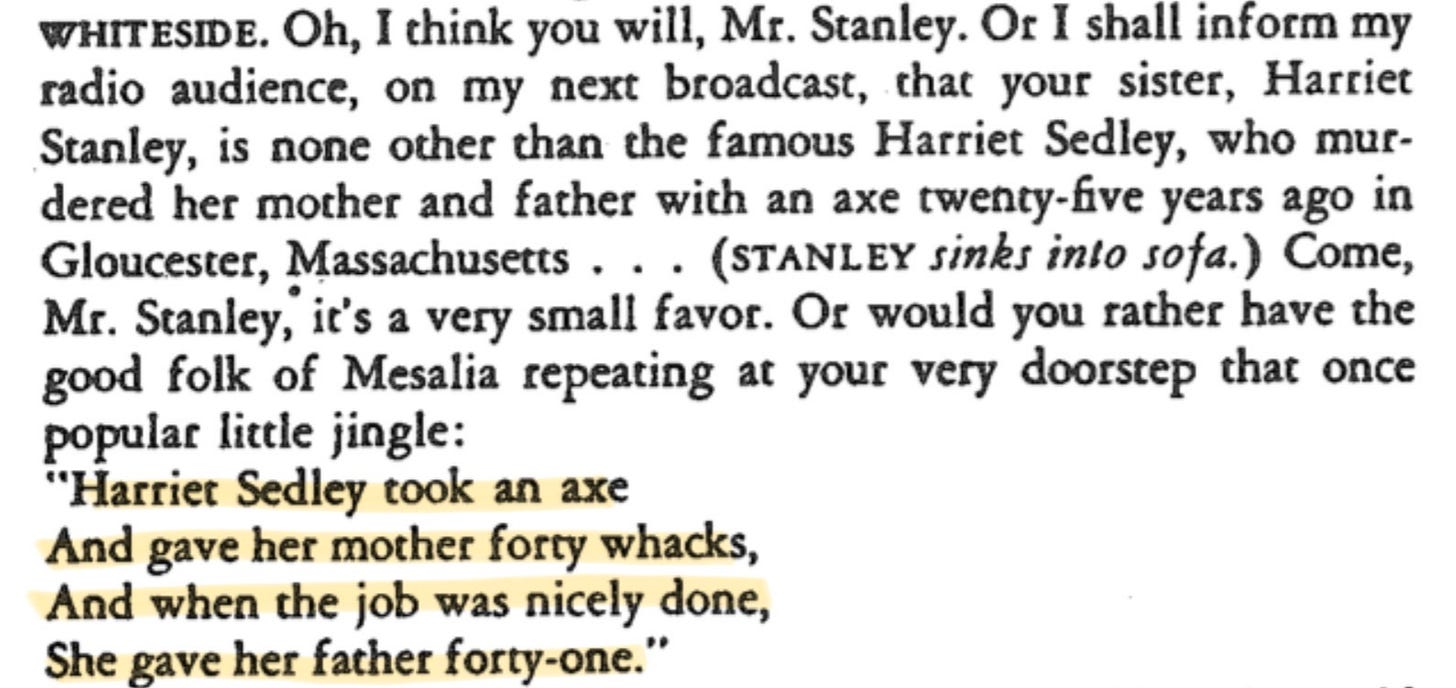 From out of nowhere he plays his trump card: He knows Mr. Stanley’s oddball sister, who lives in the house, is in fact the infamous axe murderer, Harriet Sedley. He then threatens to broadcast the dark family secret, punctuating the threat by rattling off a jingle: